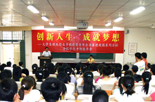6月19日下午,由團(tuán)省委學(xué)校部、青工部共同主辦,以“創(chuàng)新人生,成就夢(mèng)想”為主題的安徽大學(xué)生創(chuàng)業(yè)導(dǎo)航計(jì)劃――“青年企業(yè)家進(jìn)校園”在合肥學(xué)院隆重舉行。會(huì)上,安徽易德人力資源管理有限公司總經(jīng)理、CCTV《贏在中國(guó)》第一賽季總冠軍宋文明作了創(chuàng)新創(chuàng)業(yè)事跡報(bào)告。團(tuán)省委青工部副部長(zhǎng)路誠(chéng),團(tuán)省委學(xué)校部副部長(zhǎng)李國(guó)陽(yáng)蒞臨會(huì)場(chǎng),與我院師生一起聆聽(tīng)了此次報(bào)告。報(bào)告會(huì)由院團(tuán)委副書記宣文主持。