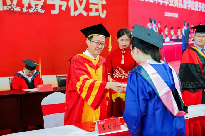 本科生畢業生代表徐桐、研究生畢業生代表詹學娟、留學生畢業生代表蘇陽、“西部計劃”畢業生志愿者代表徐思揚、教師代表孫強教授相繼發言。徐桐表示將不負學校栽培,向下扎根,投身基層,建功西部,在鄉村沃土綻放青春,服務地方,用行動與奮斗為母校增光添彩。詹學娟向母校和老師致以誠摯的感謝,并回憶了自己在校期間的科研和求學經歷,表示未來將努力提升自我,助力經濟社會的發展。蘇陽回顧了中柬長期以來友好往來、深度合作的偉大歷程,對“一帶一路”建設和合肥大學的培養表示感謝。徐思揚講述了個人“三下鄉”實踐經歷,號召廣大學子要用自己的知識和力量去服務人民,推動西部地區的發展。孫強表示,青年學子要堅守初心,不忘使命,始終保持對學習的熱情,做到學而不輟,勇敢面對未來的挑戰和機遇,保持積極昂揚的精神狀態,最終通向理想的彼岸。
