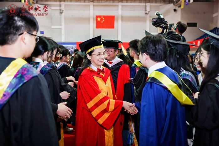 典禮最后,校領導、校學位評定委員會成員與在場畢業生握手送別、合影留念。