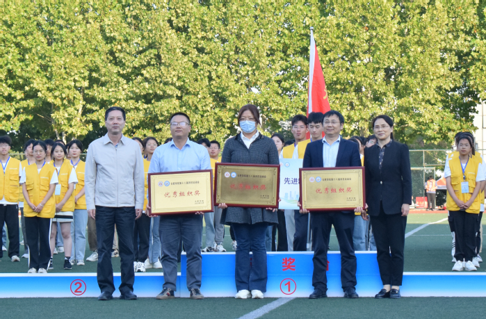 閉幕式開始,陳秀宣讀本次比賽結果:能源材料與化工學院、語言文化與傳媒學院、研究生代表隊榮獲最佳組織獎;先進制造工程學院、教育學院、人工智能與大數據學院代表隊榮獲體育道德風尚獎;先進制造工程學院代表隊榮獲團體獎第一名;人工智能與大數據學院、經濟與管理學院、設計學院代表隊榮獲團體獎第二名;教育學院、生物食品與環境學院、城市建設與交通學院、研究生代表隊榮獲團體獎第三名。校領導為獲獎單位頒獎。