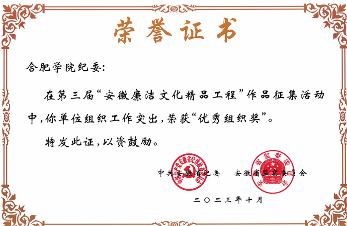 此前,紀委發布了《關于合肥學院廉潔文化作品征集的通知》,得到了全校師生的積極響應,共征集廉潔文化作品150余件,評出校級一等獎6個、二等獎8個、三等獎20個、優秀組織獎6個,獲獎作品在合肥學院紀檢監察網線上展播,并擇優推選了6件作品參加第三屆“安徽廉潔文化精品工程”作品征集展播活動,最終2件作品脫穎而出。