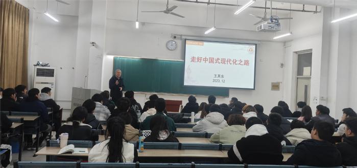 王其東圍繞中國式現代化的歷史演變、發展現狀展開授課。他回顧了近代百年在黨領導下中國人民探索中國式現代化的漫漫長路,講述了新中國成立后特別是改革開放以來的理論探索和實踐活動,重點講述了黨的十八大以來成功推進和拓展中國式現代化取得的變革與成就。他深入闡述了中國式現代化的基本特征是人口規模巨大的現代化,是全體人民共同富裕的現代化,物質文明和精神文明相協調的現代化,人與自然和諧共生的現代化,走和平發展道路的現代化。他全面分析了中國式現代化與西方現代化的本質區別,讓學生充分認識到,世界上既不存在定于一尊的現代化模式,也不存在放之四海而皆準的現代化標準,一個國家、一個民族,只有找到適合自己條件的道路,才能實現自己的發展目標。王其東對青年在實現中國式現代化過程中的重要作用提出四點希望:希望學生們立大志,用理想之光照亮青春奮斗之路;明大德,以崇德修身啟潤青春向善追求;成大才,讓增長本領成就青春搏擊力量;擔大任,以敢于擔當書寫青春壯麗篇章。