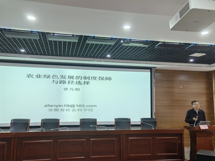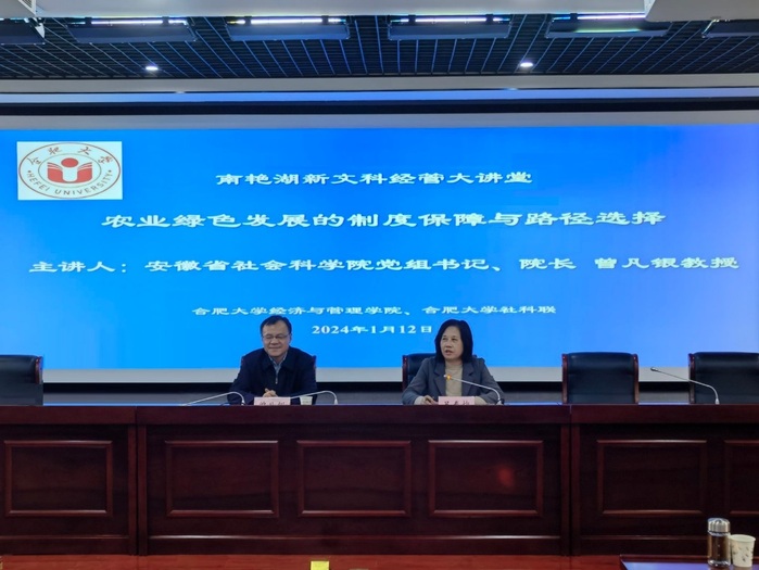 1月12號下午,經(jīng)濟(jì)與管理學(xué)院、校社科聯(lián)在6號樓學(xué)術(shù)報(bào)告廳共同主辦2024年第一期“南艷湖新文科經(jīng)管大講堂”。特邀安徽省社會(huì)科學(xué)院黨組書記、院長曾凡銀教授作題為“農(nóng)業(yè)綠色發(fā)展的制度保障與路徑選擇”的學(xué)術(shù)報(bào)告。校長吳春梅教授出席并主持,我校師生100余人到場聆聽學(xué)習(xí)。