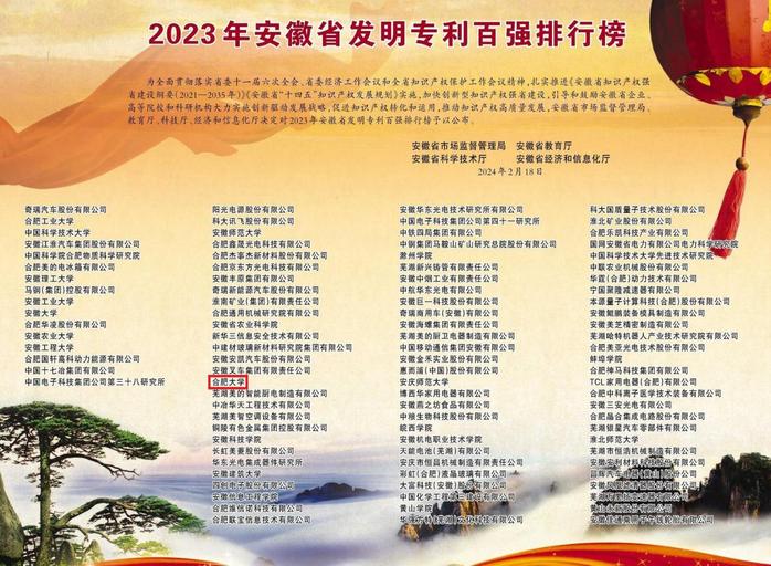 近日,省市場監督管理局、省教育廳、省科技廳、省經信廳聯合發布了《2023年安徽省發明專利百強排行榜》。我校繼2021年排名第37位、2022年排名第34位后,2023年升至第32位,連續九年進入安徽省發明專利百強榜。