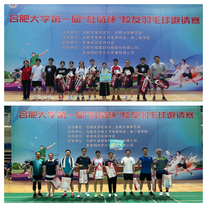 5月18日,合肥大學第一屆“杜威杯”校友羽毛球邀請賽在我校體育館成功舉辦。比賽由校友辦公室和公共體育與藝術教學部共同主辦,校教工羽毛球協會、各二級學院協辦,安徽省羽毛球協會指導,共邀請15支代表隊近130名運動員參賽。副校長陳秀致辭。