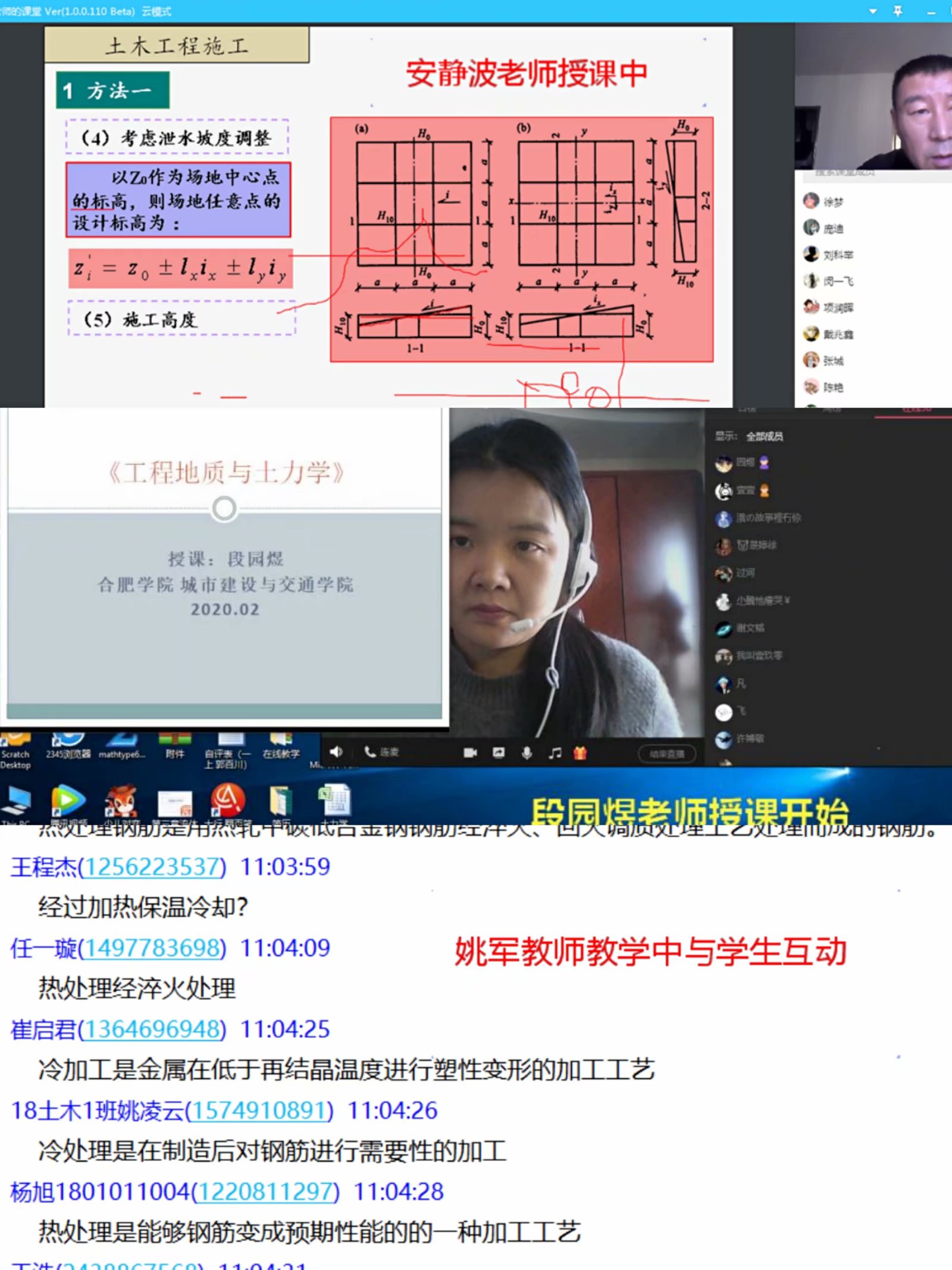 我院教師提前行動(dòng),在開(kāi)學(xué)前做好充分授課準(zhǔn)備,積極建設(shè)網(wǎng)上課程內(nèi)容和提前聯(lián)系學(xué)生進(jìn)行教學(xué)預(yù)演;在線(xiàn)上開(kāi)學(xué)后與學(xué)生共同攜手,克服各種教學(xué)困難。由于開(kāi)課前兩天出現(xiàn)大面積的網(wǎng)絡(luò)堵塞,我院教師及時(shí)采取應(yīng)急預(yù)案,采用QQ群直播間、釘釘、騰訊課堂等軟件平臺(tái)進(jìn)行實(shí)時(shí)交互式教學(xué),力爭(zhēng)按質(zhì)按量地圓滿(mǎn)完成線(xiàn)上教學(xué)任務(wù);在傳授專(zhuān)業(yè)知識(shí)的同時(shí),將課程思政融入線(xiàn)上課堂,鼓舞學(xué)生積極奮進(jìn)。對(duì)個(gè)別缺課同學(xué),課后輔導(dǎo)員和授課教師及時(shí)聯(lián)系,教師向缺課同學(xué)發(fā)放相關(guān)視頻鏈接,課件,學(xué)習(xí)任務(wù)等教學(xué)資料,并督促學(xué)生進(jìn)行自學(xué)補(bǔ)課。