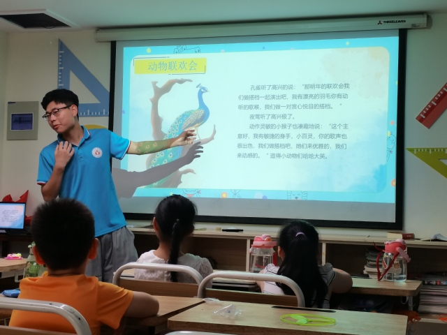 學(xué)會贊美別人,是一種能力、一種氣度;學(xué)會欣賞自己,是一種理解、一種智慧。贊美是生活中的寶貴品質(zhì),就像是盛開的花朵,當(dāng)你將其贈與他人時,自己也會收獲一份芬芳。7月7日下午,合肥學(xué)院教育學(xué)院“七彩童年,‘育’你相伴”三下鄉(xiāng)團隊來到濱湖和園社區(qū)開展社會實踐活動,團隊成員田鑫和李碩碩以“朋友,你真棒”為主題開展了一堂團體心理輔導(dǎo)課。 課堂伊始,田老師使用手語操引入課程,借此引發(fā)學(xué)生對手語歌的歌詞與動作的思考。當(dāng)歌曲《你真的很不錯》響起,同學(xué)們就模仿老師的動作開始做起手語操。在歡快激昂的音樂聲中,大家對彼此豎起大拇指,大聲說道“你是真的、真的、真的很不錯!”歌聲將歇,同學(xué)們還久久沉浸在愉悅的氛圍中。隨后,田老師給同學(xué)們講了一個充滿童趣的故事——《動物聯(lián)歡會》,故事中,孔雀與夜鶯相互欣賞、彼此贊美。歌曲與故事互相映證,讓同學(xué)們更深入地理解“每個人都有自己的特色,人們在相處交往時就像在照鏡子,你欣賞別人,別人也就會欣賞你”這一課程主題。