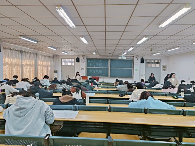 11月15日中午12點15分,教育學院在3棟101教室舉行第二十一屆青馬團課結業考試。團委學生會主席周天藝、芮鷺潔,團委學生兼職副書記李艾錦,組織部部長朱思宇和副部長周琴擔任監考人員,28名學員參加本次考試。
