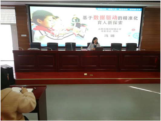 馮璐校長主要向師生們介紹了合肥師范附小聚焦五育并舉視域下的學校評價改革、利用數字技術助力學校的課堂評價、學生綜合素質個性化評價等方面做出的精準化育人新探索。重點探討了為什么需要數據驅動“精準化育人”、 數據技術如何賦能日常學習、如何繪制個性化圖譜驅動精準育人等三個方面問題。報告會得到了與會人員的高度贊同和認可。