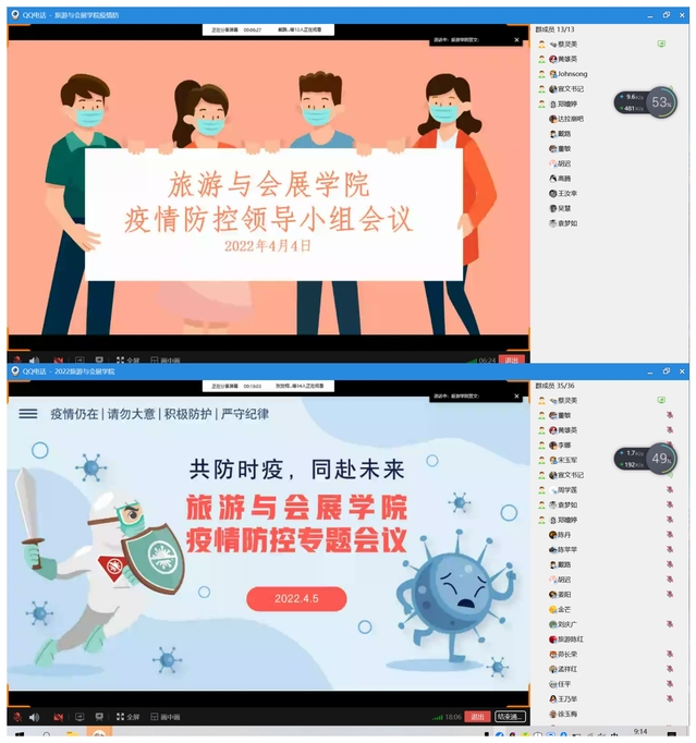 4月5日,旅游與會展學院召開線上疫情防控專題會議暨學院工作會議。會上,副院長鄭嬗婷指出,要加強線上教學的管控、及時掌握不在校的畢業生論文開展等情況、開展人才培養方案修訂的論證等工作。副書記黃雄英指出,在校園封閉期間輔導員要嚴格落實疫情防控政策,及時關注學生健康碼、核酸檢測等信息統計上報,通過走訪寢室等方式關注學生學習、生活及心理狀態,關注畢業生就業情況。黨委書記宣文首先分析了目前疫情防控的嚴峻形勢,要求大家提高政治站位、責任落實到位、從嚴從快從緊從細從實的開展疫情防控工作。接著,宣書記傳達了4號教育廳召開的疫情防控會議精神。隨后,宣書記對全院教師提出了學習疫情防控相關文件要求、配合學校門禁檢查、做好個人及家人防護、按規定一周進行2次核酸檢測、提高線上教學質量、嚴格值班制度、成立志愿者隊伍、及時關注群信息并回復等12點要求。院長宋玉軍強調指出,各位老師要思想不放松、行動要落實、杜絕麻痹大意,不信謠、不傳謠、不造謠,處理好疫情與線上教學、論文指導、課程建設、教科研工作的關系;學生工作方面要摸清重點群體和不在校學生情況,抓住班干、黨員等關鍵少數,包保到人,做好應急處置;面對疫情,希望大家人人參與、齊心協力、堅定信心,共筑防疫戰線。最后,各位老師就相關問題進行了討論,提出了多項便于疫情防控工作開展的建議。