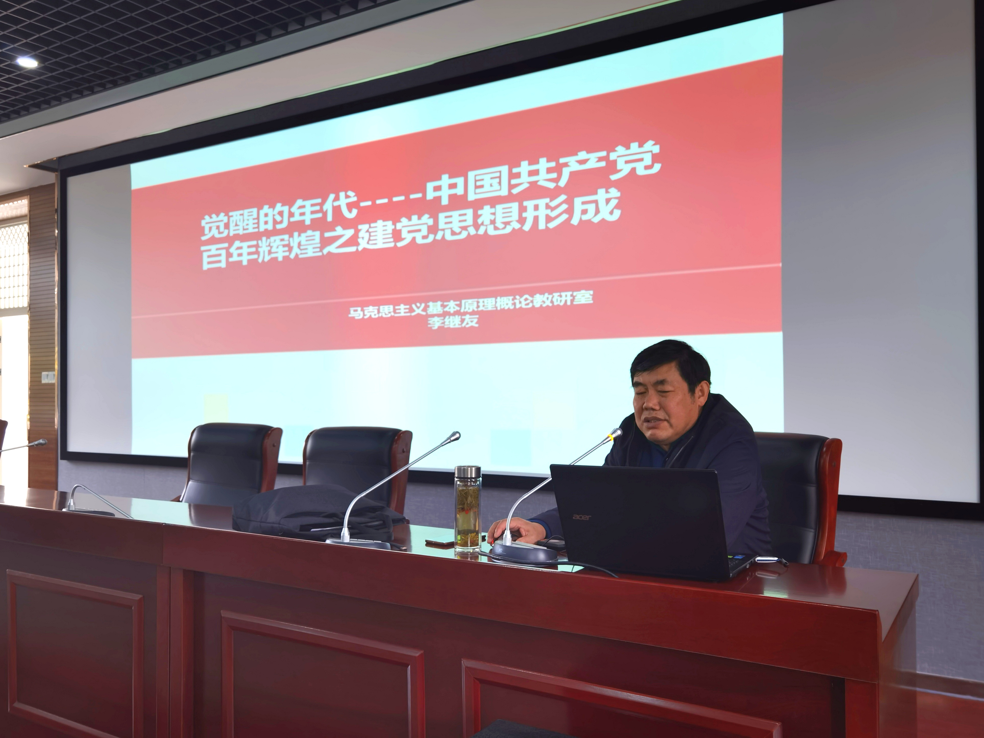 值此中國共產黨成立100周年之際,為進一步豐富黨員的基礎知識,重溫黨的輝煌歷史,3月30日中午,外國語學院邀請馬克思主義基本原理概論教研室主任李繼友老師于六號樓一樓會議室講授“覺醒的年代——中國共產黨百年輝煌之建黨思想形成”黨史課。本次學習由外國語學院黨委書記余勇主持,學院全體師生黨員,民主黨派、無黨派教師,黨員發展對象同學70余人參加。