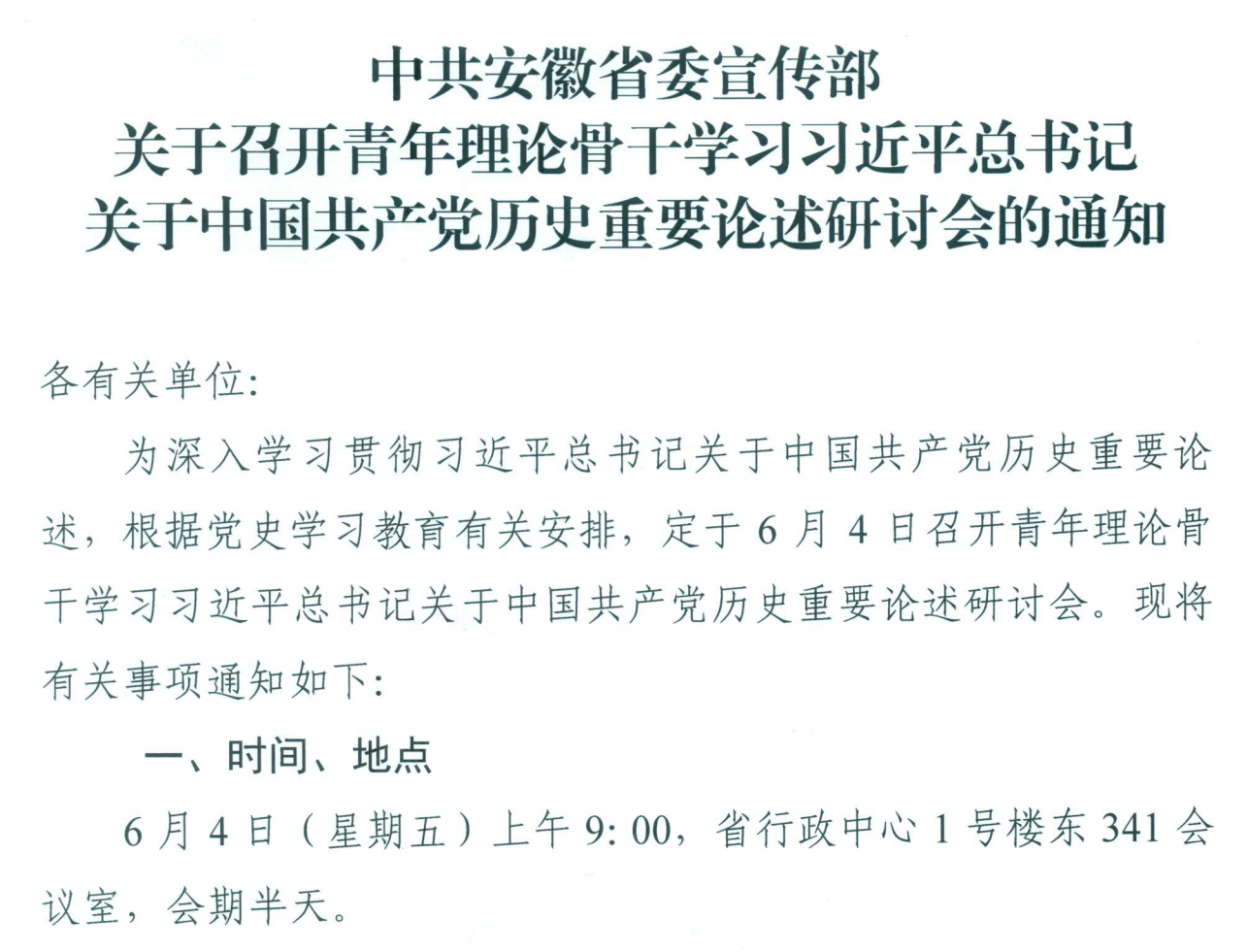 2021年6月4日上午,中共安徽省委宣傳部在合肥召開青年理論骨干學習習近平總書記關于中國共產黨歷史重要論述研討會。安徽省委常委、省委宣傳部部長陶明倫出席會議并講話,省委宣傳部副部長李兵主持會議。我院張波、王霞、劉昆、謝敏芳、彭慧艷五位老師參加研討會。