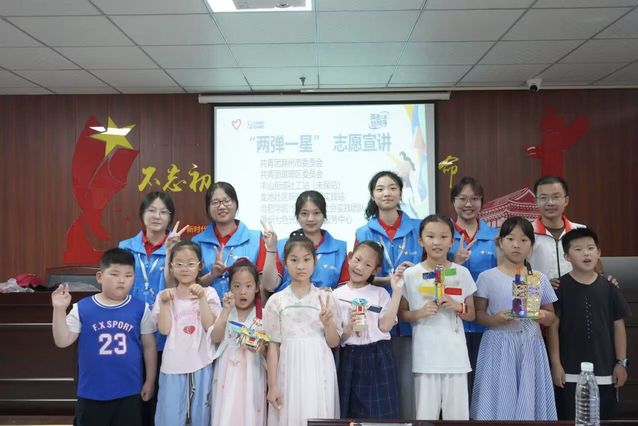 團隊成員以“兩彈一星”為中心主題,前往龍池社區進行支教活動,向前來學習課程的小朋友介紹我國核工業的發展。課程內容由我國核工業發展的三個三十年引入,通過一個視頻短片讓小朋友們認識了“中國核潛艇之父”之一的彭士祿。隨后,團隊成員介紹了彭士祿的生平事跡和偉大成就,展示了他為祖國事業犧牲的偉大精神。最后,團隊成員和小朋友們一起動手,為航天模型涂上顏色,并一起合影留念。
