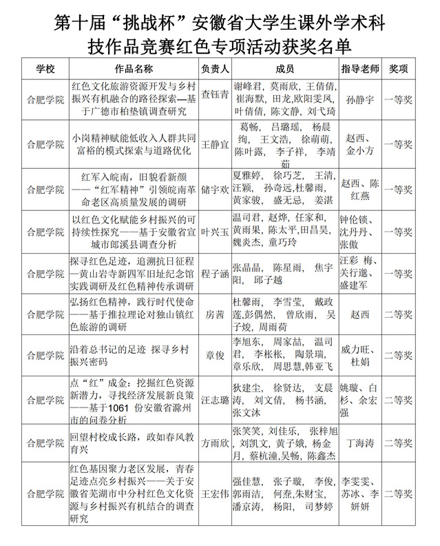 在校賽階段,共計(jì)收集作品29件,經(jīng)校內(nèi)評選,最終推薦12件參加省賽其中《紅色文化旅游資源開發(fā)與鄉(xiāng)村振興有機(jī)融合的路徑探索—基于廣德市柏墊鎮(zhèn)調(diào)查研究》《小崗精神賦能低收入人群共同富裕的模式探索與道路優(yōu)化》《紅軍入皖南,舊貌看新顏——“紅軍精神”引領(lǐng)皖南革命老區(qū)高質(zhì)量發(fā)展的調(diào)研》《以紅色文化賦能鄉(xiāng)村振興的可持續(xù)性探究——基于安徽省宣城市郎溪縣調(diào)查分析》《探尋紅色足跡,追溯抗日征程——黃山巖寺新四軍舊址紀(jì)念館實(shí)踐調(diào)研及紅色精神傳承調(diào)研》5件作品榮獲省級一等獎(jiǎng)。