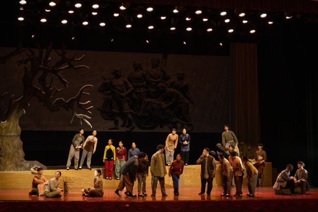 歌劇《向前》主要講述淮海戰役期間“小李莊”青年淮山帶領周邊群眾冒著槍林彈雨、忍受風雪饑寒支援前線,最后壯烈犧牲的故事以淮山去前線送糧為主線展開敘述,以個體代表群像展現了淮海戰役中起到重要保障作用的萬千群眾,同時“以點帶面”描繪了淮海戰役期間男女老幼齊上陣的生動畫卷,還原了淮海戰役中軍民水乳交融、生死與共的壯觀歷史場景